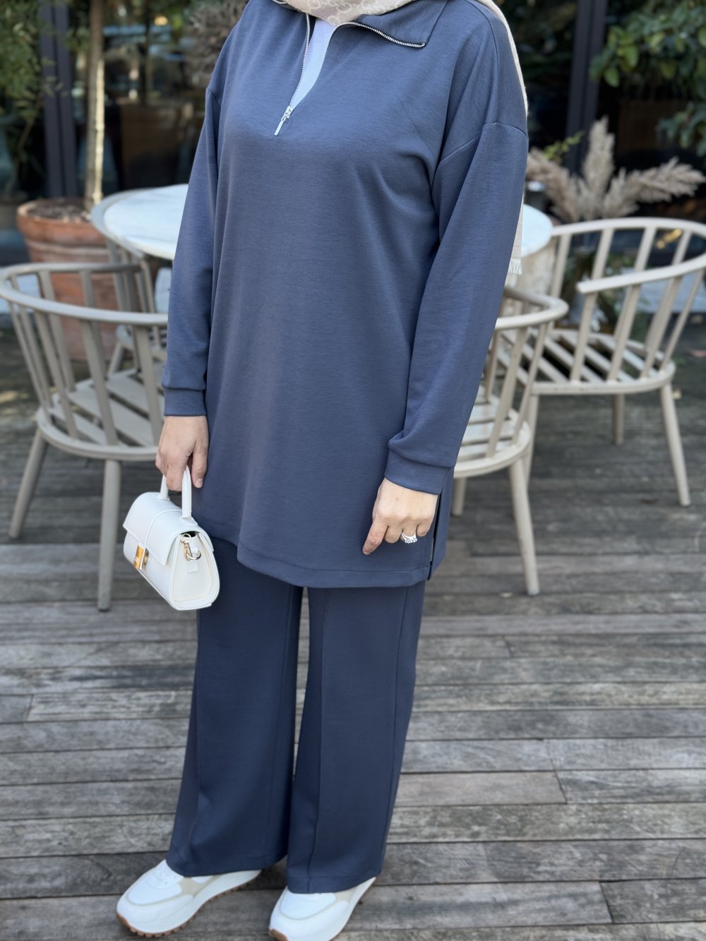 Her mevsim kullanıma uygun zarif takım, günlük rahatlık ve modern detaylarla bir araya geliyor. Fermuar detaylı tunik, şık görünümü tamamlarken, beli lastikli pantolon hareket özgürlüğü sağlar. Yırtmaç detayı ise ekstra bir zarafet katar.