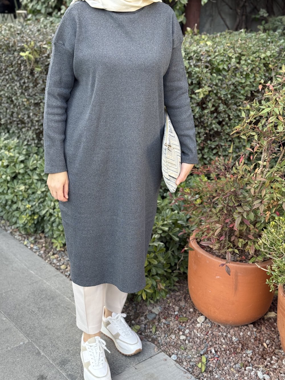 Basic Uzun Tesettür Tunik Gri