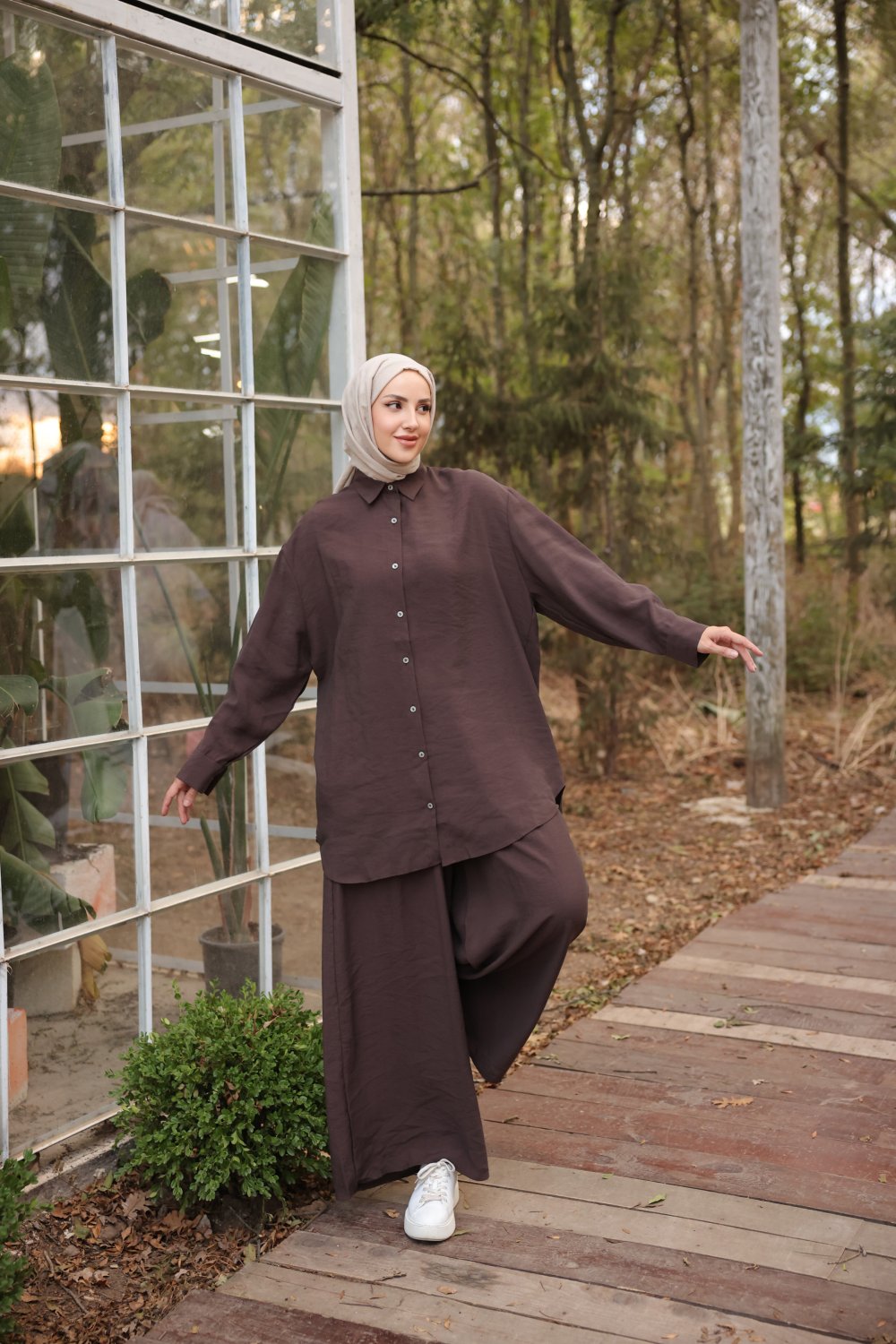 Bol kesimi ve yumuşak dokusu sayesinde gün boyu rahatça giyilebilecek bu takım, doğallığı ön planda tutanlar için ideal bir tercihtir. Şıklığı sneakers ayakkabılarla tamamlayarak casual bir stil yakalayabilirsiniz.